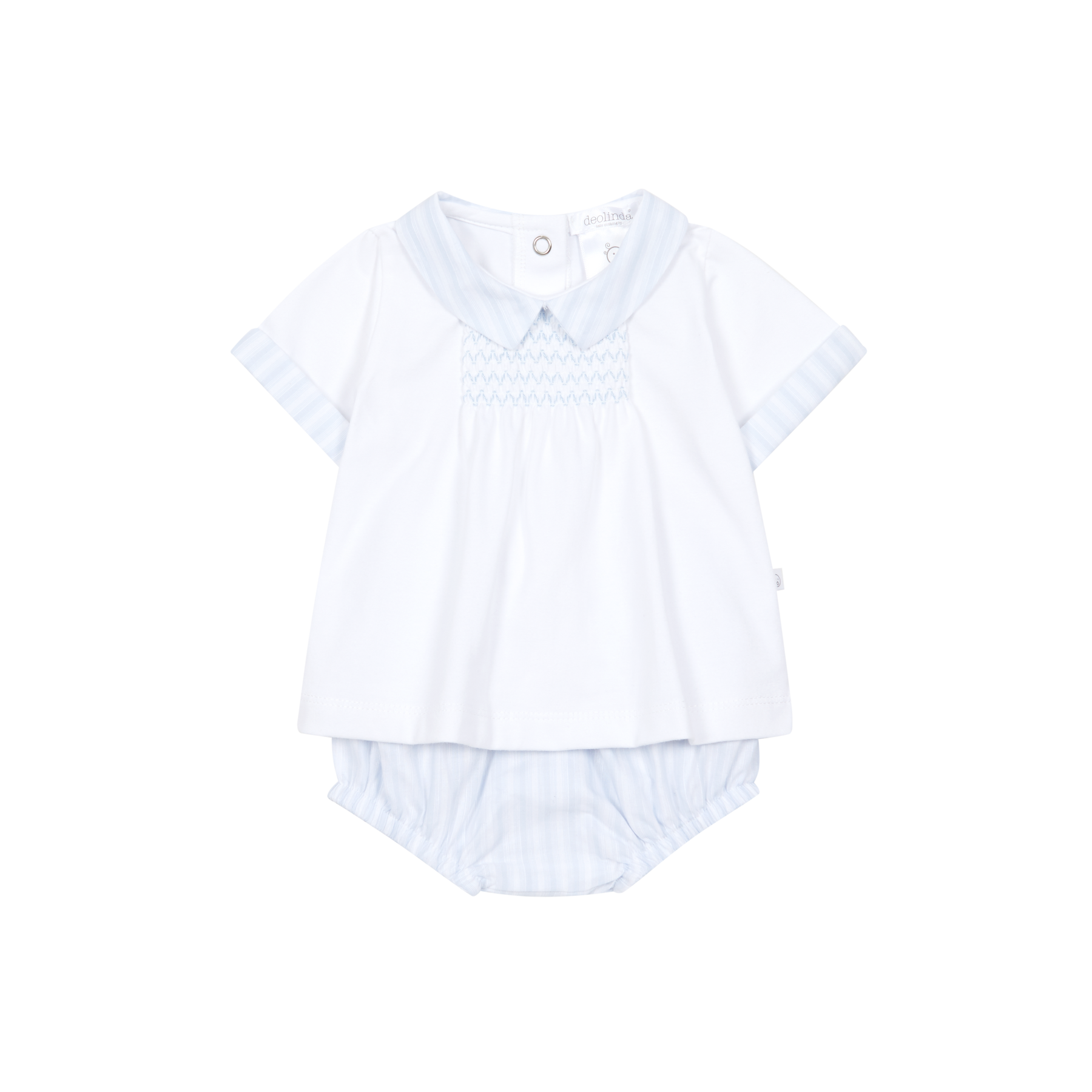 This classic white and blue smocked baby boy outfit features soft cotton fabric, delicate hand-smocking, and a timeless Peter Pan collar with matching bloomers. Designed for comfort and style, it’s perfect for summer wear, special occasions, christenings, and everyday dressing. A traditional boutique baby outfit ideal for babies and toddlers.