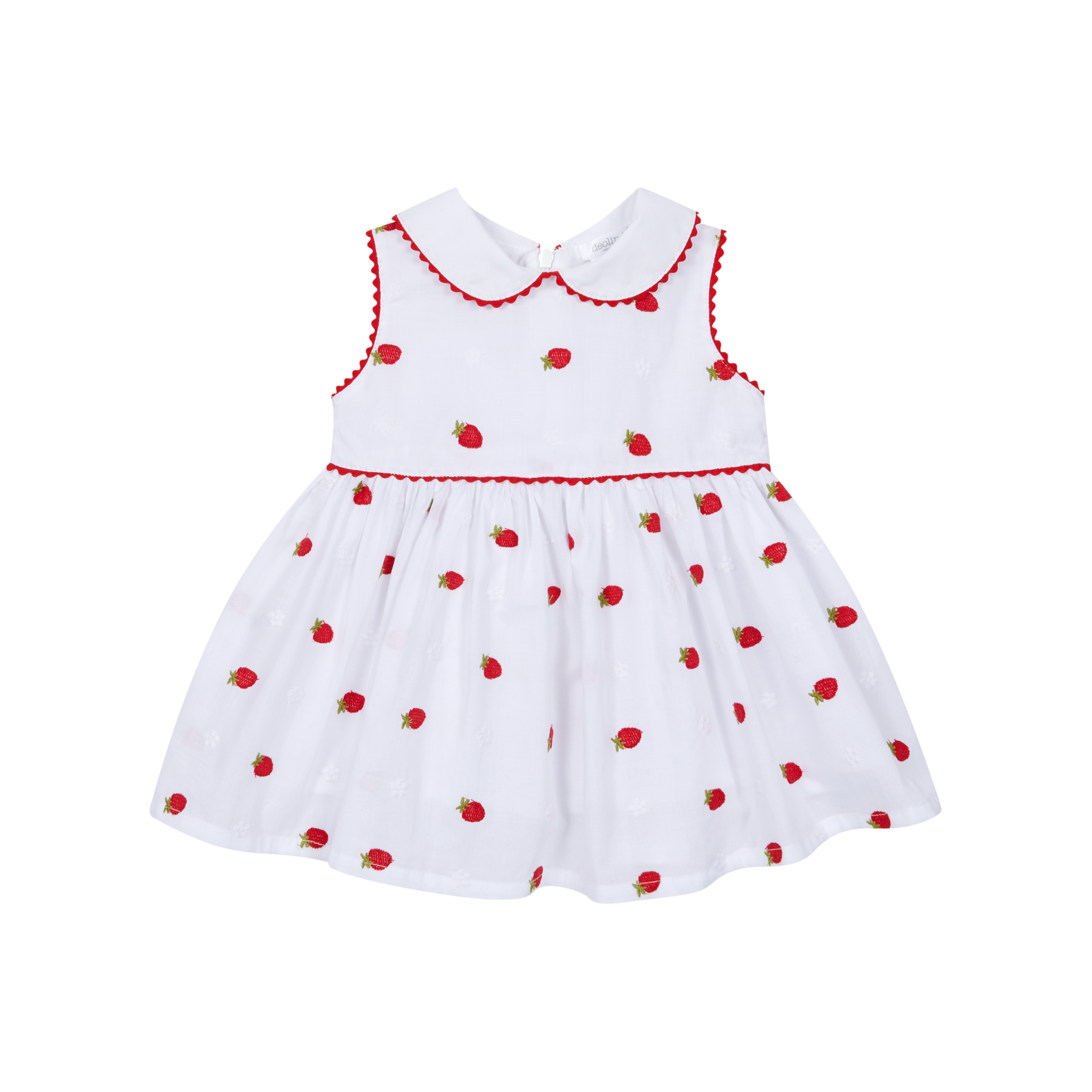 This charming girls strawberry embroidered dress is perfect for sunny days and special moments. It features a classic Peter Pan collar, delicate red trim, and a full skirt designed for comfort and movement. Ideal for holidays, family outings, and summer events, this toddler girls summer dress pairs beautifully with sandals for a timeless warm-weather look.
