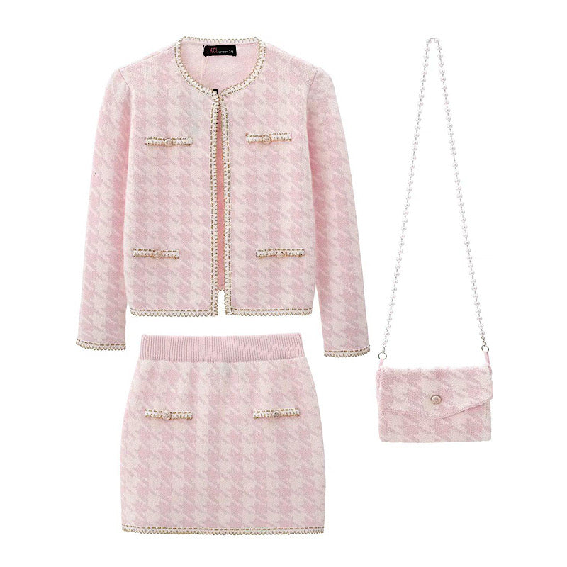 Crafted in a soft pink and white houndstooth check, the set includes a tailored long-sleeve jacket, a matching skirt, and a coordinating shoulder bag.