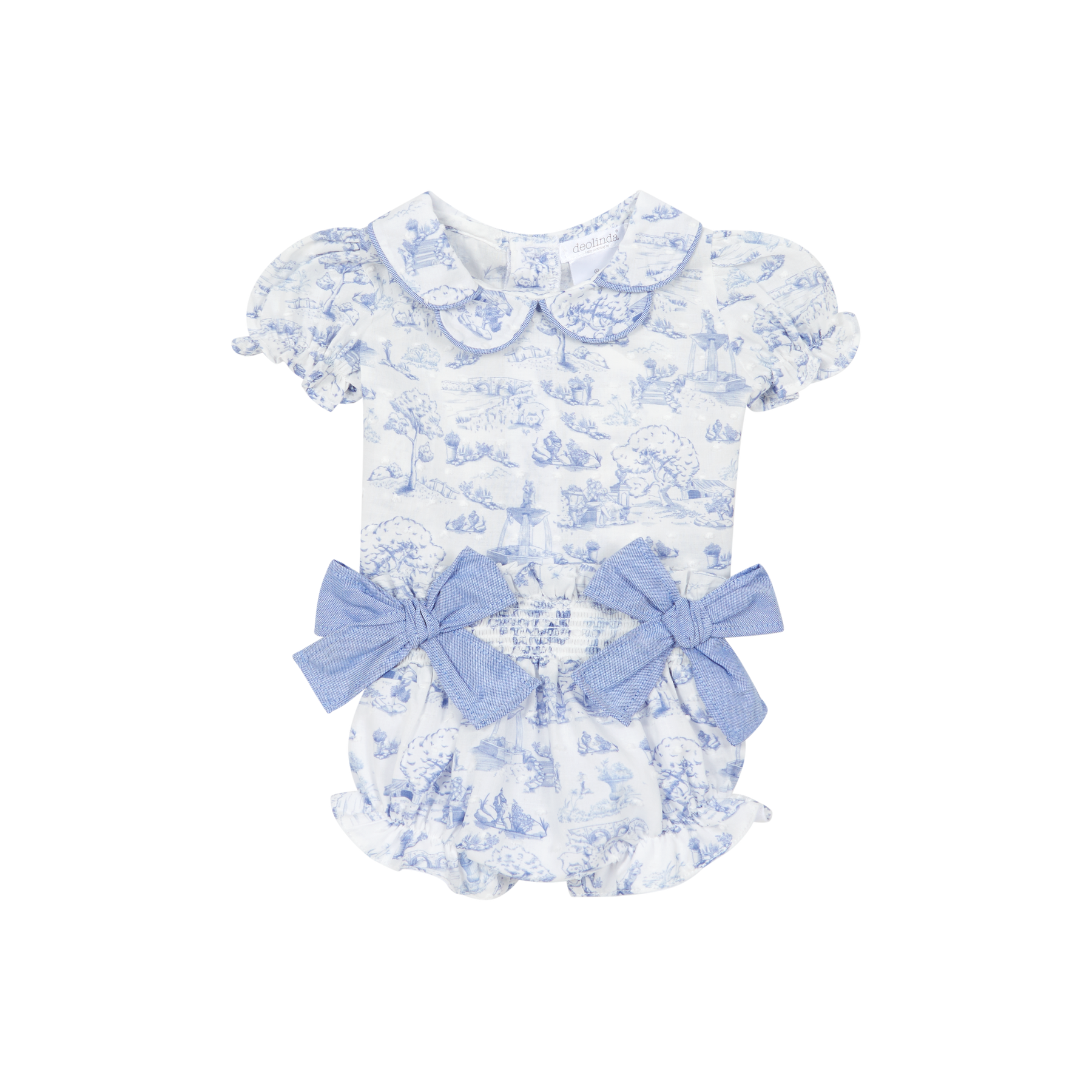 This beautiful blue toile baby girl romper features soft cotton fabric, a scalloped peter Pan collar, puff sleeves, the jam pants have a delicate bow detailing at the waist. Designed for comfort and timeless style, it’s perfect for summer wear, special occasions, photos, and everyday dressing. A classic boutique jam pant set for babies and toddlers.