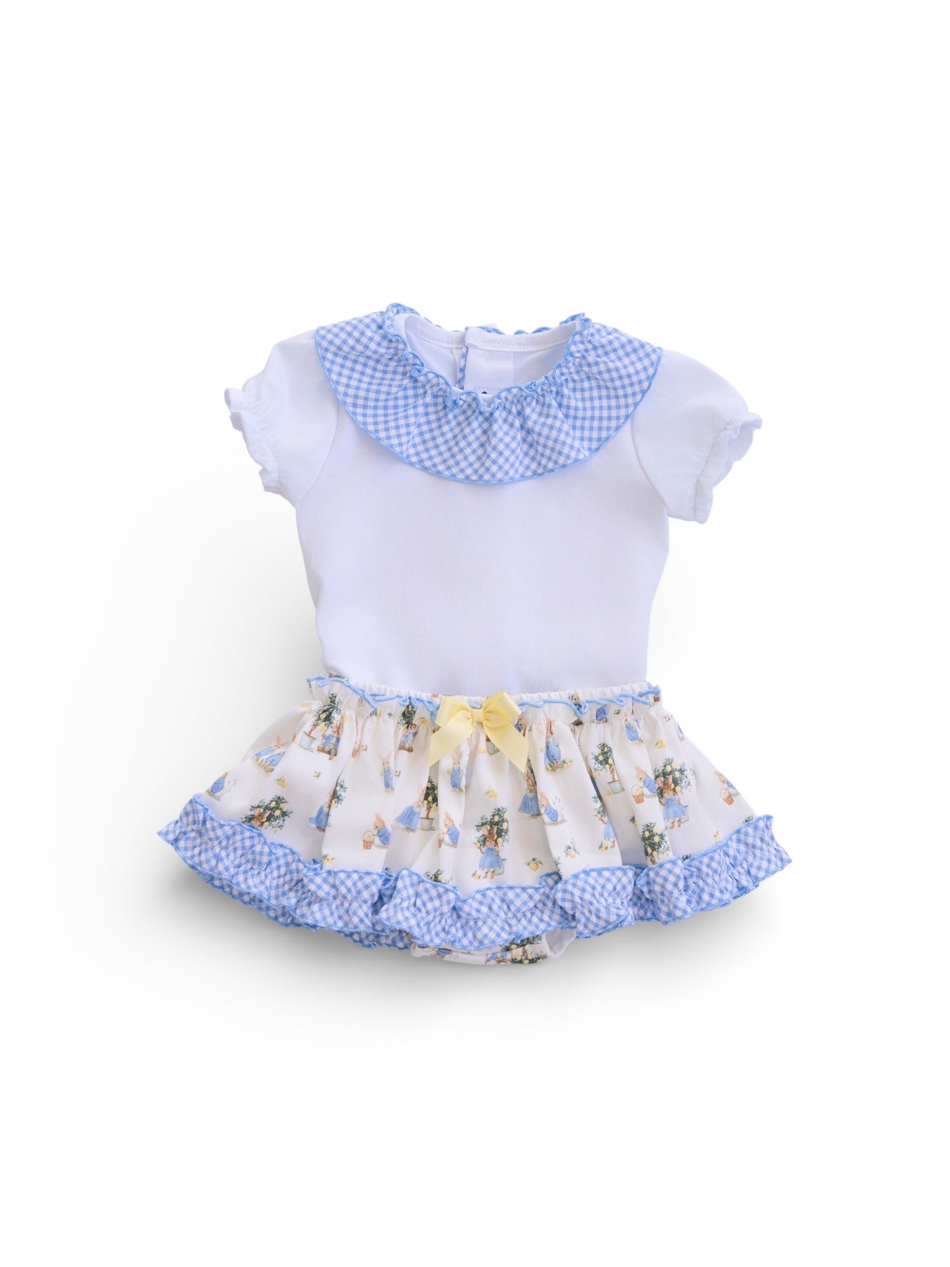A sweet baby outfit featuring a soft white- sleeve top with a light blue gingham ruffle collar. The skirt has a adorable bunny illustrated print, a matching gingham ruffle hem, a yellow bow at the waist for a finishing touch.