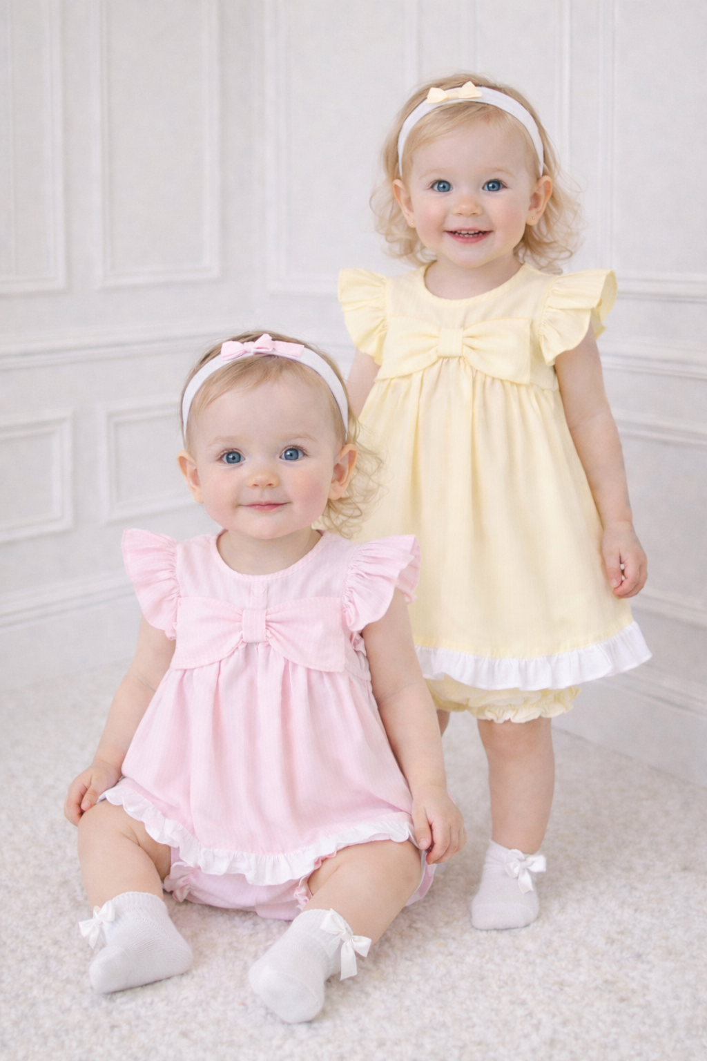 This beautiful baby set features a soft, lightweight dress with delicate flutter sleeves and a statement bow detail at the front. Designed with a gentle gathered shape and matching bloomers for comfort, it’s perfect for special occasions or everyday wear. Finished with a coordinating headband, it’s a timeless look for your little one.