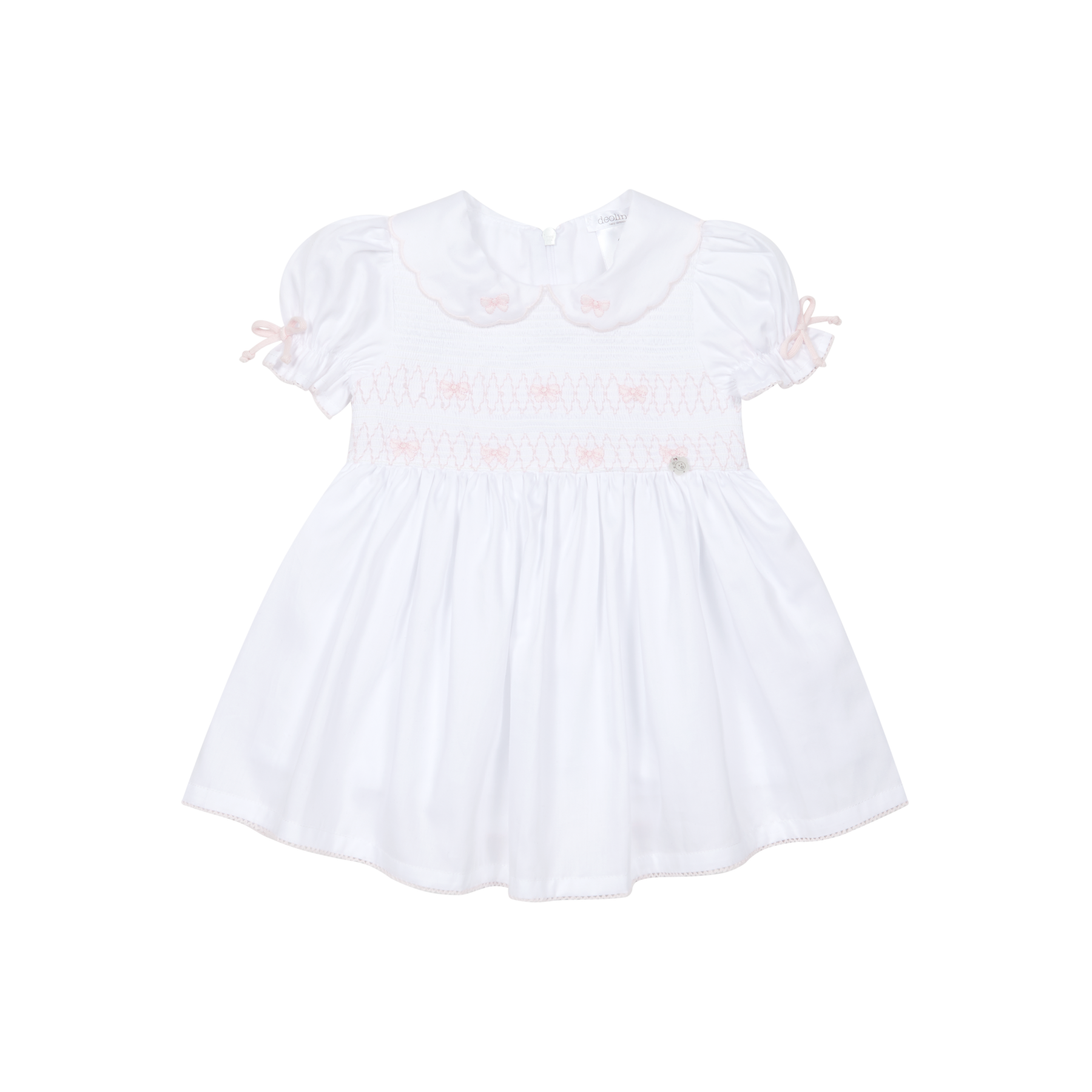 Classic white toddler dress with delicate pink hand-smocked embroidery, a traditional Peter Pan collar, and softly puffed short sleeves finished with bow details. Featuring a lightweight, flowing skirt for comfort and movement, this elegant girls dress is ideal for christenings, special occasions