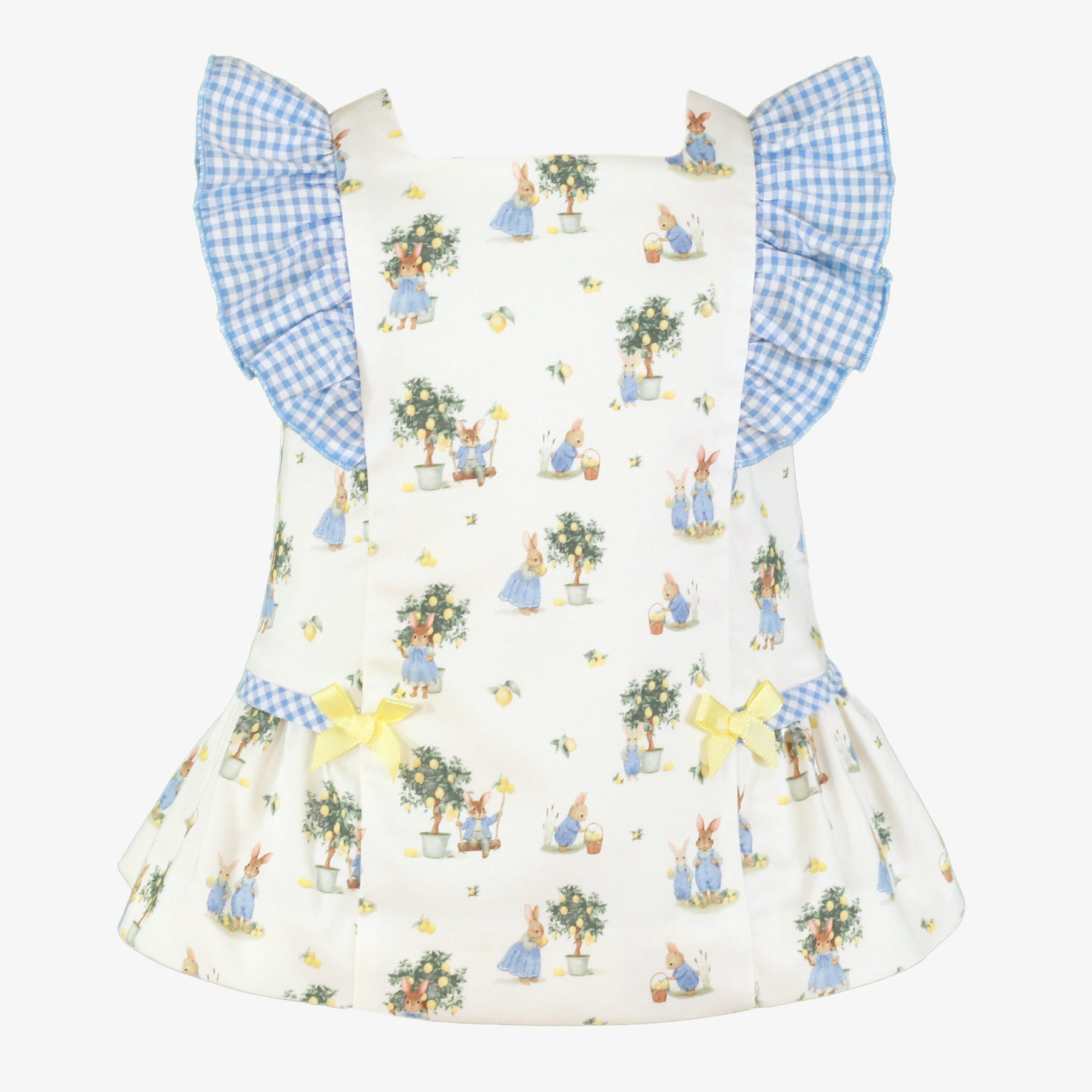 A charming baby dress featuring a soft ivory fabric with a sweet bunny and lemon tree print. Designed with blue gingham ruffle sleeves, a gently flared skirt, and delicate yellow bows at the waist, this dress offers a timeless look with playful detail. Matching knickers that have an elasticated waist for comfort. Perfect for special occasions or everyday wear.