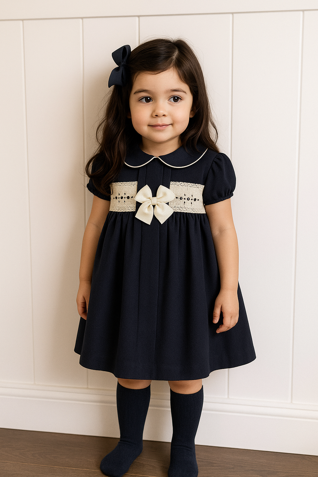 Pretty Originals Navy Smocked Dress & Hair Bow Clip 251259